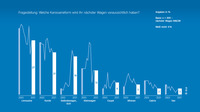 Dahinter landet der Kombi trotz leichter Einbußen mit einem potenziellen Kaufanteil von 21 % auf Platz 2. Ein wenig bergab ging es für die Karosserieform „SUV/Geländewagen“. Heute können sich noch 19 % der Teilnehmenden vorstellen, eine offroad-taugliche Variante zu wählen. Somit scharen die drei beliebtesten Karosserieformen rund zwei Drittel der Autokaufenden hinter sich.